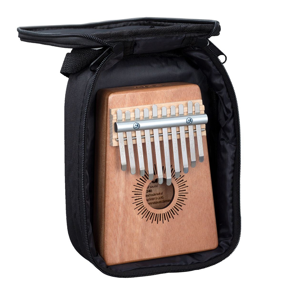 Калимба изготовлена из высококачественного красного дерева. Корпус усиливает низкие частоты и, таким образом, производит полный, чистый и теплый звук с завораживающим резонансом. Высококачественные металлические язычки настроены в до мажоре и имеют диапазон от c' - e'' (C4 - E5). Обозначение нот на язычках делают калимбу подходящей как для начинающих, так и для опытных музыкантов.